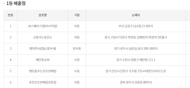 854회 로또당첨번호 당첨지역 1등은 총 6곳으로, 부산 금정구에서 자동, 경기 고양시에서 자동, 경기 광주시에서 반자동, 경기 수원시에서 수동, 경기 안산시에서 수동, 경북 경주시에서 자동이며 로또당첨지역 모두 다른곳에서 1등이 나왔습니다.