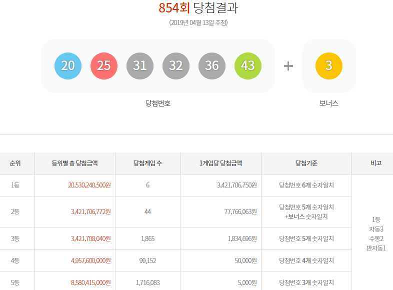 854회 로또당첨번호 1등 번호는 20, 25, 31, 32, 36, 43이며 보너스번호는 3 입니다.