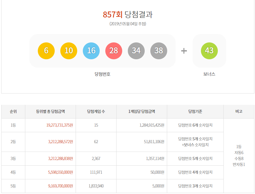 857회 로또복권 당첨번호 는 6, 10, 16, 28, 34, 38이며 보너스숫자는 43이며 이번 857회 로또복권 당첨번호 1등은 총 15명이 나왔습니다.