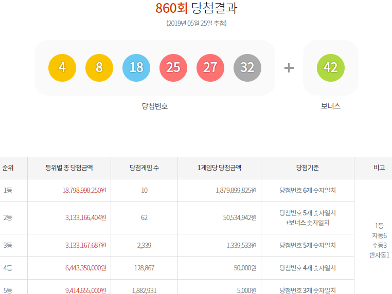 860회 로또당첨번호는 4, 8, 18, 25, 27, 32이며 보너스번호는 42 1등 당첨자는 총 10명으로 자동 6명 수동 3명 반자동 1명입니다.