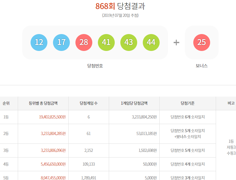 868회 로또 당첨 번호 1등 숫자는 12, 17, 28, 41, 43, 44이며 2등 보너스번호는 28로 수동3명 자동 3명의 당첨자가 나왔답니다.