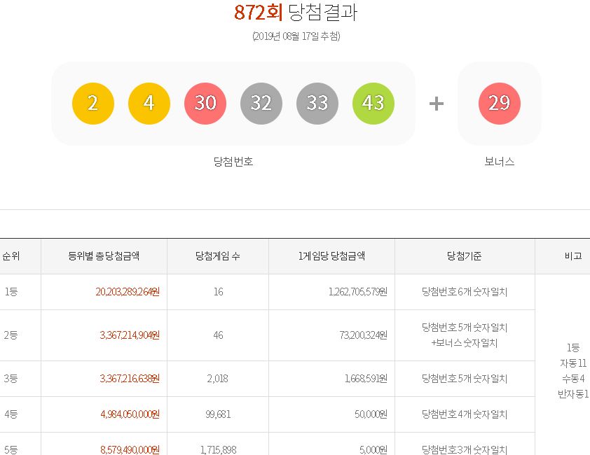 오늘 행운의 1등의 숫자는 2, 4, 30, 32, 33, 43이며 2등의 보너스숫자는 29로 이번 872회로또 당첨 번호 1등 당첨자는 총 16명이 나왔으며 1명당 12억6,270만원의 당첨금이 지급됩니다.